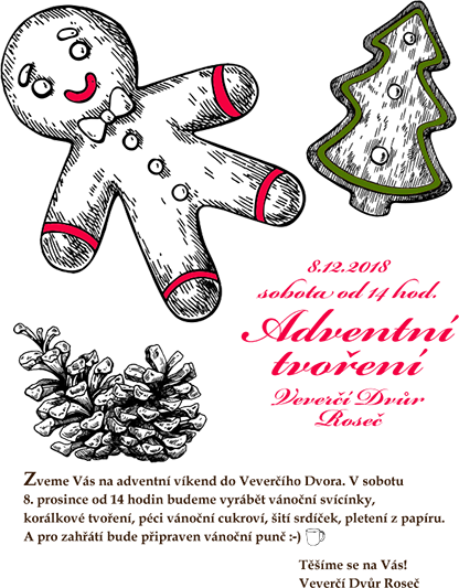 Vyrobte si vlastní vánoční dekorace. Veverčí Dvůr Roseč zve návštěvníky na adventní tvořivou dílnu, kde se budou vyrábět vánoční svícínky, dekorace z korálků, péct vánoční cukroví, šít srdíčka a plést z papíru. To vše za vůně vánočního punče.