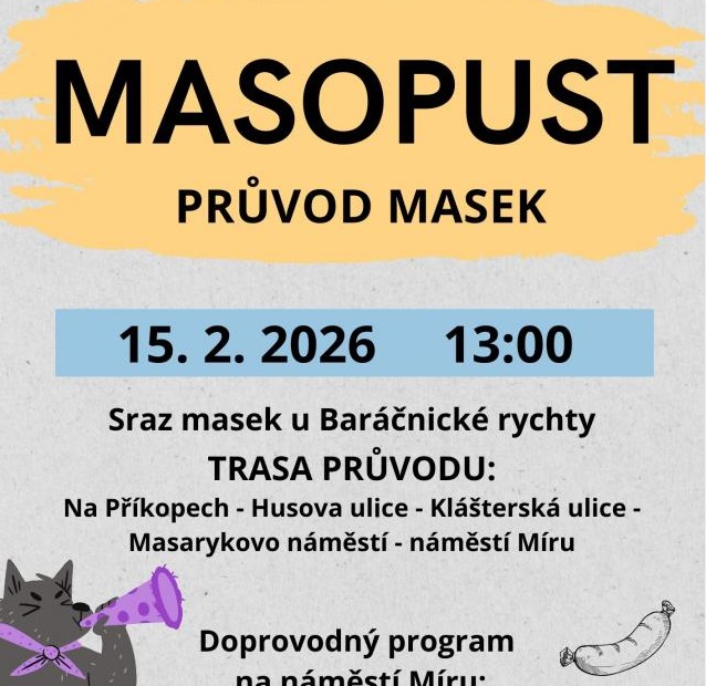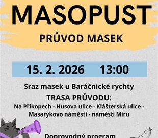 Masopustní veselí odstartuje ve 13:00 u baráčnické rychty v ulici Na Příkopech. K pestrému průvodu masek se může přidat úplně každý – v masce i bez, od nejmladších až po ty nejstarší. Za doprovodu živé hudby projde průvod ulicemi Na Příkopech, Husovou a Klášterskou na Masarykovo náměstí, kde na přihlížející čeká krátká scénka. Poté se maškary vydají Panskou ulicí až na náměstí Míru, kde vypukne pravá masopustní veselice s hudbou, tancem a zabijačkovými pochoutkami.