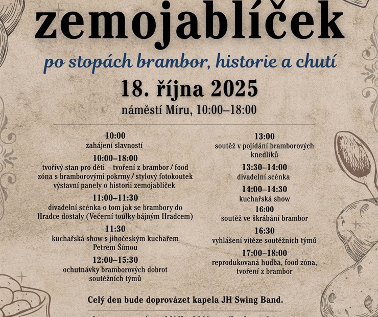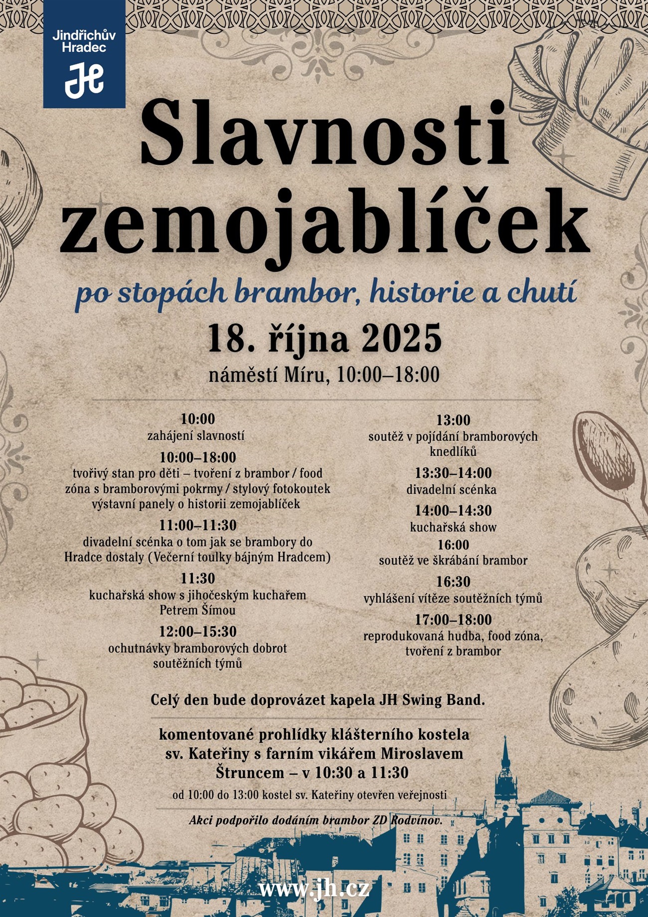 Od 10:00 do 18:00 vás na náměstí Míru čeká pestrý program pro malé i velké. K dobré náladě zahraje JH Swing Band pod vedením kapelníka Karla Pixy, o zábavu se postarají také divadelní scénky Slavnosti zemojablíček – oslava brambor v Jindřichově Hradci Martina Musila s vypravěčkou Věrou Kubátovou na téma historie brambor v Jindřichově Hradci. Připraveny jsou různé soutěže – třeba v pojídání bramborových knedlíků nebo v nejrychlejším škrabání brambor – a chybět nebude ani dětský koutek, kde se bude tvořit nejen z brambor. Veškeré brambory pro soutěžní týmy a soutěže na pódiu poskytne partner akce ZD Rodvínov. Velkým lákadlem bude kuchařská show s oblíbeným jihočeským šéfkuchařem Petrem Šímou. Pět soutěžních týmů se pustí do vaření bramborových specialit. A právě návštěvníci rozhodnou, kdo se stane vítězem.
